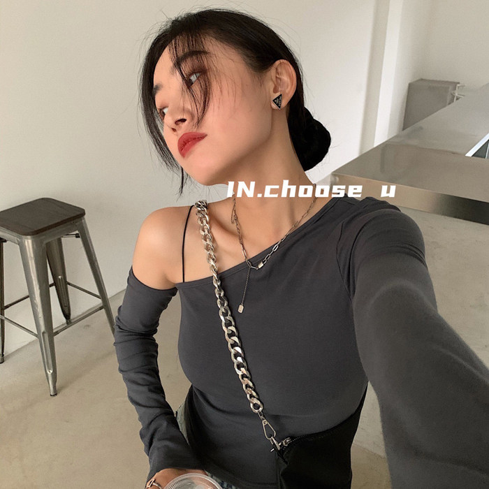 IN choose u笑笑家2021秋 设计感不规则露肩长袖修身显瘦 T恤上衣热门设计联盟服务商