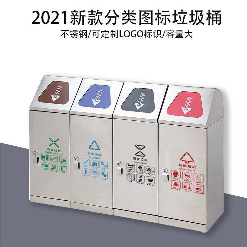 不锈钢分类垃圾桶四分类公共场合室内大号厚新分类图标垃圾桶商用热门设计联盟服务商