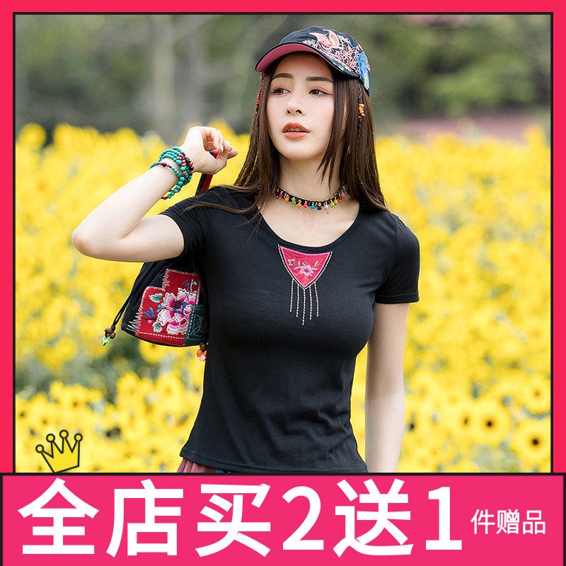 夏季女士衣服莫代尔力刺绣黑色t恤设计感小众短袖2021年新款女热门设计联盟服务商