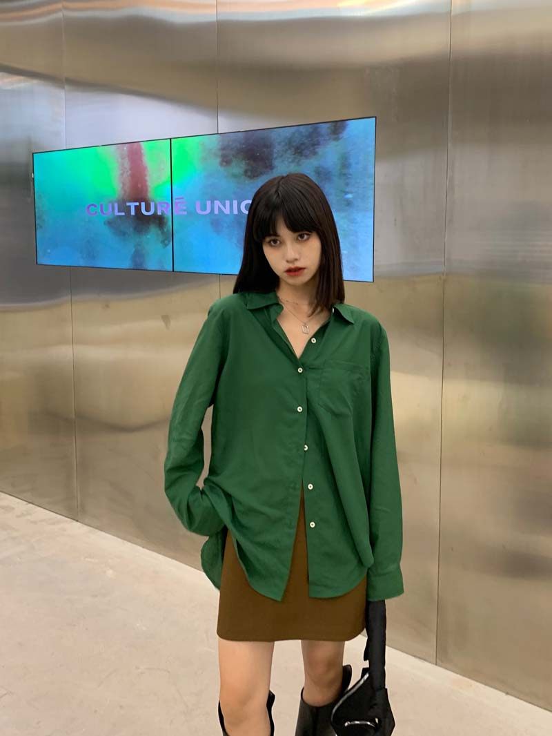 辫子时 森林绿色雾霾蓝宽松简约后开叉设计天丝衬衫热门设计联盟服务商